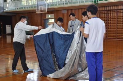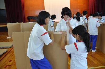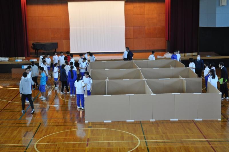 11月1日(水)防災学習として、避難所開設の体験をしました。能登町の危機管理室から講師の先生を迎え、小木中学校に備えてある段ボール間仕切りや屋内用テント設営の実習を行いました。初めは試行錯誤しながらなかなか上手くいかないようでしたが、慣れてくるとテキパキと作業を進め、完成させることができました。この体験を生かして、11日の町防災訓練の時に、素早く避難所開設ができるように頑張ってほしいです。