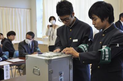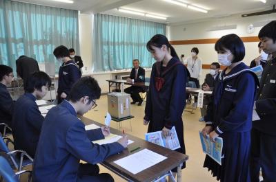 11月22日(水)に3年生が、能登町の「中学生有権者育成事業」として、模擬投票の体験をしました。選挙権が18歳からになったことから行われている事業です。最初は、緊張した顔をしていましたが、終わった後は、「結構簡単だった」等の感想を持っていました。
