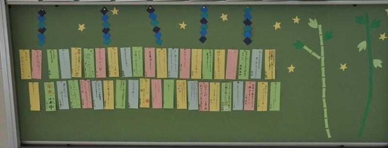生徒会広報委員会の企画で、「七夕」の願い事の短冊を作成しました。2階へ向かう階段の踊り場のところに、広報員会で工夫をして展示しています。