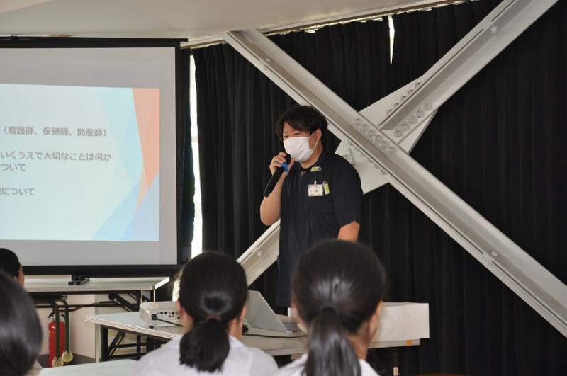 7月13日(木)、総合的な学習の時間に「キャリア教育講演会」を実施しました。本校の卒業生で宇出津総合病院の看護師である坂下 有仁さんに講師をしていただきました。看護師の仕事内容やどうしたらなれるのかなど、細かく説明していただきました。普段は見たり触ったりできない「手術道具」などももってきていただき、生徒も実際に触ることができるなど貴重な経験となりました。たくさんの生徒が質問したり、終了後も手術道具を実際にさわったりなど、最後まで興味を持ってお話を聞くことができました。お忙しいなか、ご講演いただいた坂下様に感謝いたします。ありがとうございました。