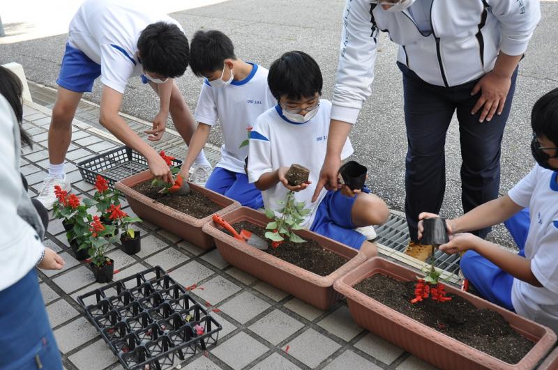 玄関前のプランターに、3年生はマリーゴールド、2年生はベゴニア、1年生はサルビアを植えました。
