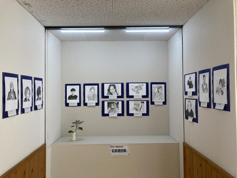 学校の1階、生徒玄関から少しランチルームに向かったところに、生徒が作成した美術等の作品を展示するギャラリーがあります。これは、以前購買部があった場所を改装して作ったものです。作品の展示は、主に美術科・技術科担当の正木先生が担当しています。現在は、3年生が制作した「鉛筆細密画」が展示されています。どの作品も丁寧に仕上げられていて大変見ごたえがあります。