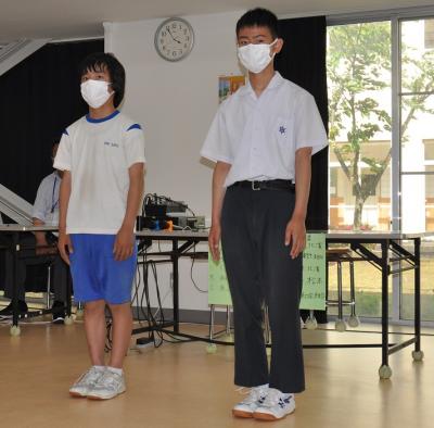 本日、野球部の県体予選に向けて壮行式を行いました。2年間以上「心の中」で歌っていた応援歌も、約3年ぶりに歌いました。「小木中校歌」「九十九湾頭」がランチルームに響きわたり、選手の2人は、明日の試合に向けて決意を新たにしていたようです。
