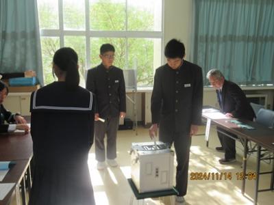 11月14日(木)3年生が、能登町中学生有権者育成事業として町選管の方から選挙のしくみを聞いたり、模擬投票をしたりしました。生徒会の役員選挙では、投票したことがありますが、本物の投票箱に投票するのは初めてで、少し緊張しながら体験することができました。貴重な機会を設定していただいた町選管の皆様、ありがとうございました。