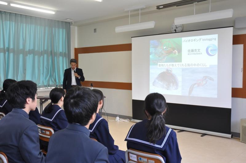 11月29日(金)東京大学大気海洋研究所の佐藤 克文教授にご来校いただき、東京大学海洋アライアンス出前授業を受けました。「バイオロギングで明らかにする動物の行動や環境」と題して、ペンギンの海中での様子を機会を取り付けて解析する話やオオミズナギドリの研究を通して、恐竜時代の翼竜が本当は飛べなかったのではないか?といった話をしていただきました。中学生のも分かりやすいお話で生徒たちは興味をもって80分の講義を受けることができました。