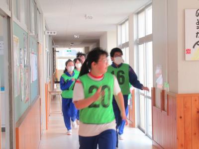 始めに行われた「ふえおに」は、小木中の校舎全部を使った鬼ごっこです。制限時間内に逃げ切った生徒が勝者となります。全部で2回行われ、1回目は勝者なしでしたが、2回目には4人の勝者が出ました。この4人に対して、自然と称賛の拍手が出ていたところが素敵でした。