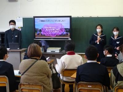 生徒会の2年生が、プレゼンで学校の様子を紹介しました。