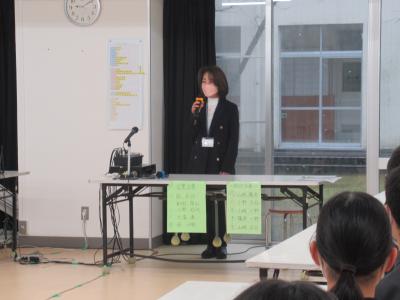 3学期の始業式後に、支援員の出口先生の紹介がありました。出口先生は昨年度まで小木中学校で勤務してくださっており、3学期から小木中学校復活となります!昨年度のように毎日ではありませんが、週2回小木中学校のために尽力していただきます。出口先生よろしくお願いします。
