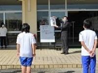 この行事は,防災教育の一環として,津波から自分の身を守るために高い場所にできるだけ速く駆け上がることを目的として行われています。約700Mの距離ですが,きつい坂道を駆け上がるのは大変です。開会式で校長先生は「克己」という言葉を示され,「きつくても歩かずに最後まで走り切ってほしい」という話をされました。