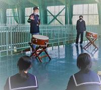 小木中文化祭のオープニングに向けて,3年生は小木の祭りばやしを練習しています。今年はコロナウィルス感染症の予防のため袖キリコの巡業が中止となったことや文化祭を何とか盛り上げたいという意気込みから,祭ばやしを演奏することとなりました。
