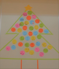 24日(火)の今日は、クリスマス・イブです。小木中では、広報委員会の企画で、即席クリスマスツリーにサンタさんにお願いしたいプレゼントを貼りました。さて、今晩はみなさんの家にサンタクロースは来るのでしょうか?