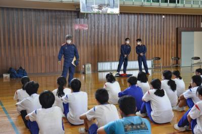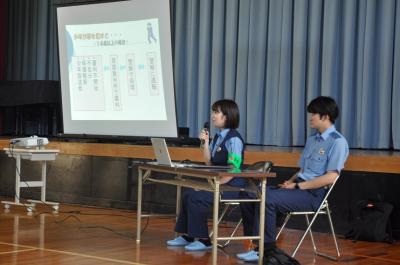 7月5日(金)珠洲署から生活安全課のお二人に来校頂き、不審者対応の避難訓練と非行被害防止講座を開きました。まず、職員の不審者対応訓練を実施しました。不審者役の警察官を自由に動き回らせないよう職員で対応しました。その後、体育館で現在の非行の状況や被害に遭わないようにするためにはのヒントになるお話を聞きました。