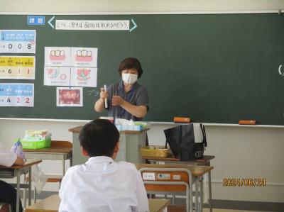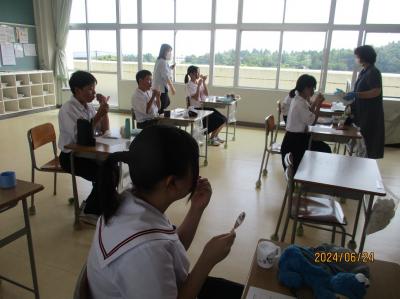 6月24日(月) 1年生を対象に「歯みがき教室」を行いました。小下先生から歯みがきのコツを習い、染め出しで磨き残しがないかの確認をしました。上手に磨けている人やもう少しの人がいました。これからは、習ったコツを活かして上手に磨いてほしいと思います。歯を大切にしていきましょうね。