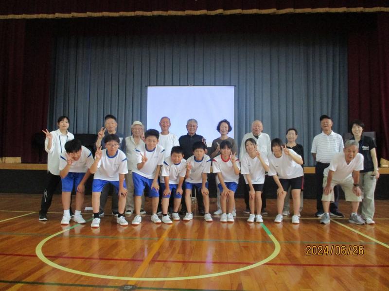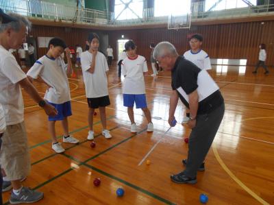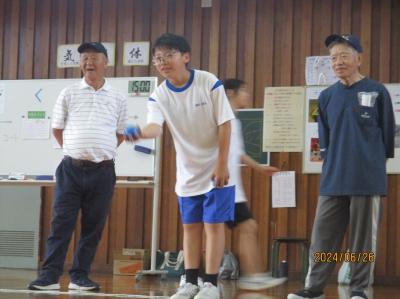6月26日(水)、1年生の総合的な学習の時間に地域の老人会の皆さんと交流を行いました。防災教育の一環として、もし何かあったとき地域の皆さんにも声かけして避難できるようにということを目的に行っています。例年は、グランドゴルフで交流していましたが、震災の関係で小木中体育館でペタンクを行いました。老人会の皆さんと競り合いながら楽しんでいました。後半には、生徒が考えたクイズなどの発表も行いました。