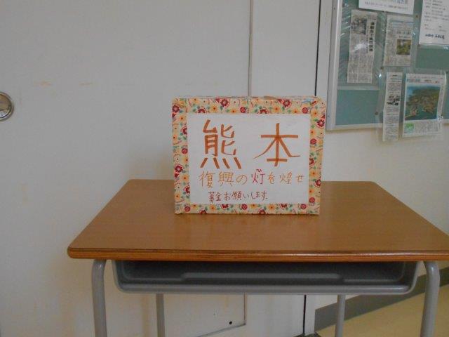 余震、本震、逆の場合もあること、また、大きな揺れの認識のマグニチュードのものが続けて起こっていることに、驚愕のおもいです。生徒たちも、情報を知るにつれ、避難所で体を動かすのに「防災体操のCDを送ればいいよ」とか「地震に備えての体操だから違うんじゃない」などと話をしています。何かしなければと思っています。そして、生徒会が、まず、校内で義援金を募る活動を始めました。明後日の火曜日には、しんやスーパーさんの前で、募金活動をします。