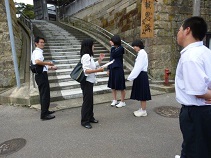 5月26日午後から27日午前にかけて、大阪府摂津市の教育委員会、市内5ブロックの小中学校代表の教諭、市の担当の方、総計8名が本校の防災活動を視察のため来られました。防災教育のカリキュラム、防災活動の様子、防災集会を見ていただいたり共に体験していただきました。皆さん大変熱心で、本校のいいところを評価して下さり、摂津市に帰ってから取り組む意欲をもらったと言っていただきました。