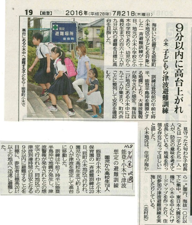 2016年7月25日 14時37分保小中高合同避難訓練の翌日、北陸中日新聞と北國新聞の記事を掲載します。NHKのニュースでも、3回取り上げられていたそうです。学校でも録画予約してみました。3年生の2人はインタビューでも的確に答えていました。