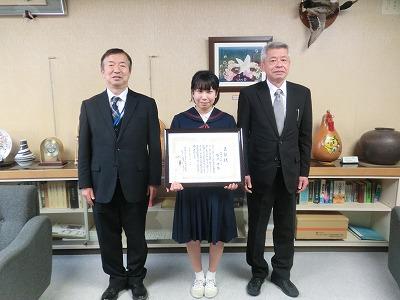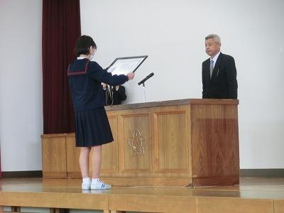 3月の学校集会が行われ、その後に清水賞の表彰式が行われました。藤井副理事長から6年の盛戸佳奈さんに賞状と副賞が贈られました。おめでとうございます!!