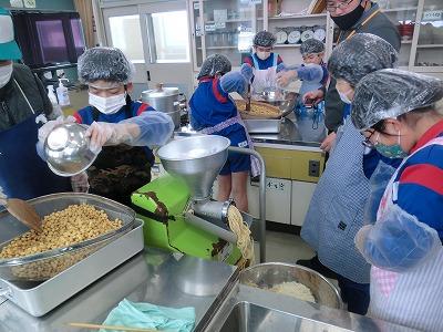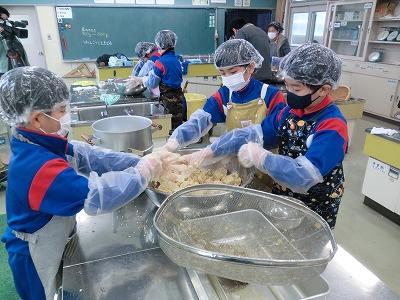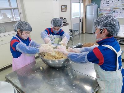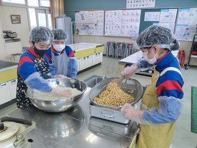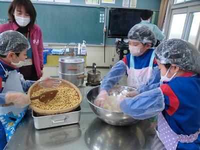 本日3,4限目には、髙﨑さんのご指導の下、3年生がみそづくり体験をしました。1学期から育ててきて、2学期に収穫した大豆を使って、3学期はいよいよみそづくりです。子どもたちは、2時間ほど蒸した大豆をかき混ぜながら冷まし、機械を使ってミンチ状にし、塩、麹と合わせてかき混ぜ、だんご状にして桶に投げ入れました。とてもテキパキ動いてくれたおかげで、予定より早く作業を終えることができました。