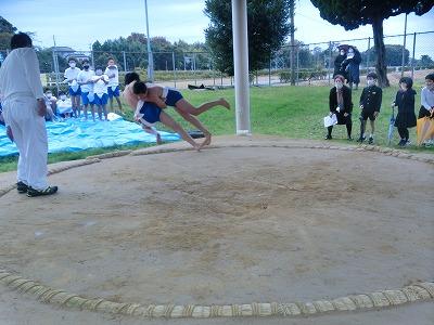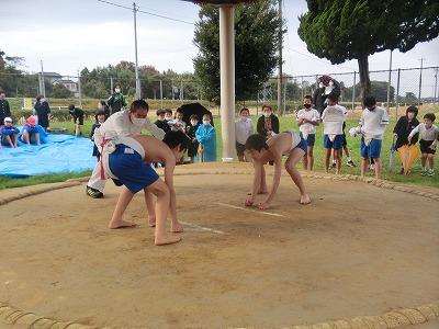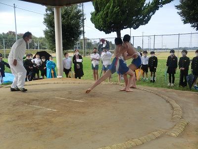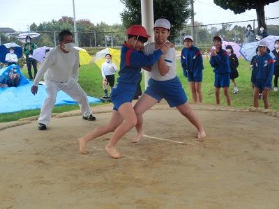 そして5,6限目には、6年生の相撲大会を実施しました。新型コロナの感染者が急拡大したことで、夏に行う予定だった相撲大会が中止となりました。しかし、6年生はこれで最後となるので、秋に延期できないかと時期を模索した結果、この学校公開の時期に行おうということになり、6年生だけの相撲大会を実施しました。子供たちは最初恥ずかしそうにしていましたが、1~3年生や保護者の声援を受け、力いっぱい相撲をとっていました。