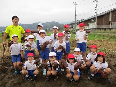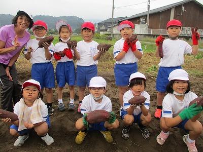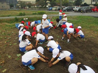 1,2年生がサツマイモほりを行いました。夏は雑草の中に隠れるような状態でしたが、たくましく育っていました。大きなサツマイモが出てくると大きな歓声があがり、とても楽しそうに芋掘りをしていました。