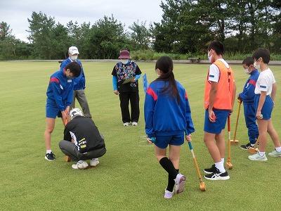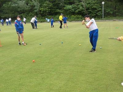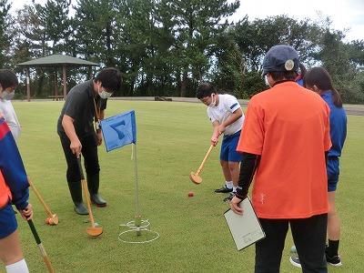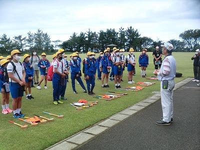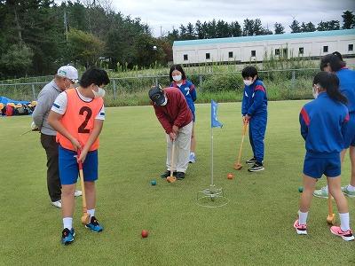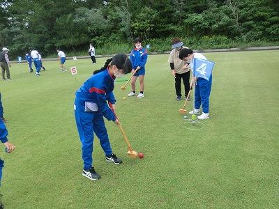 本日、5,6年生が遠足に行きました。行先は高松グラウンドゴルフ場で、グラウンドゴルフ体験をしました。かほく市グラウンドゴルフ協会の皆様の協力のもと、グラウンドゴルフに挑戦しました。各チームに協会員の方がついて、丁寧に指導してくれました。その後、コースを回り、ホールインワンが2回出るなど、指導の成果を十分に発揮していました。
