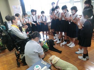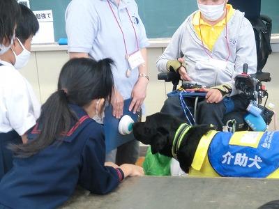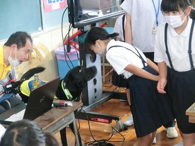 5,6限目に4年生が介助犬について学習しました。全国で58頭しかいないそうで、石川県では1頭だということで、大海小に来たピースケ君がその貴重な1頭になります。(もう1頭、引退した元介助犬タフィーも来ました)介助犬を利用している平野友明さんから、介助犬を利用することになった経緯から生活していくうえでどのように助けてもらっているかなど、わかりやすく映像を見せながら、また、実物を見せながらお話していただきました。直接、介助犬とふれあうことができたことで、子どもたちはより一層介助犬に関心を持ったようでした。ご協力いただいた、平野さん、かほく市福祉協議会、石川県福祉協議会の皆様、本当にありがとうございました。