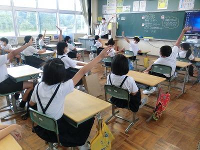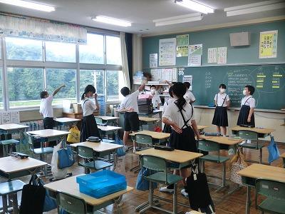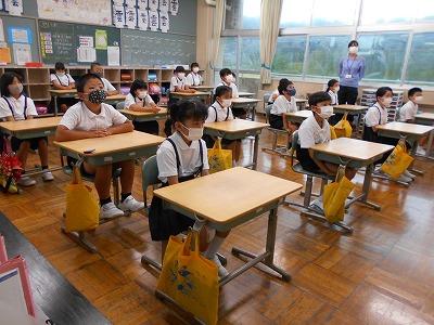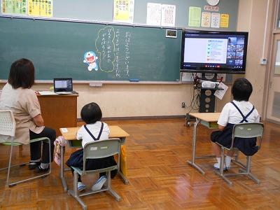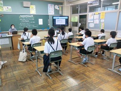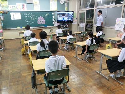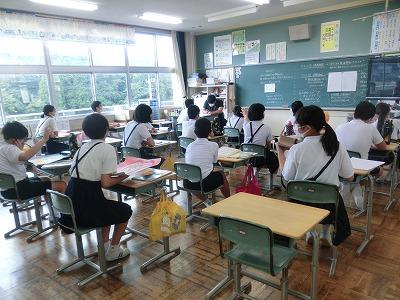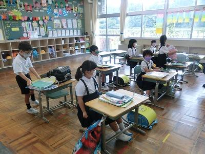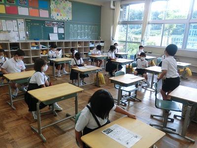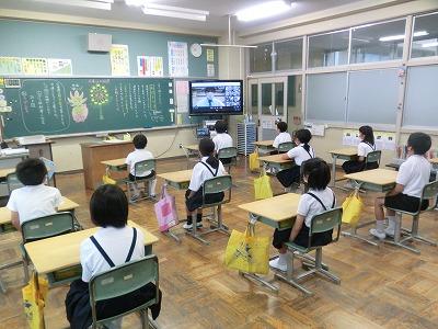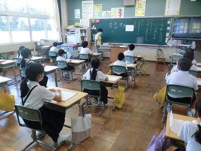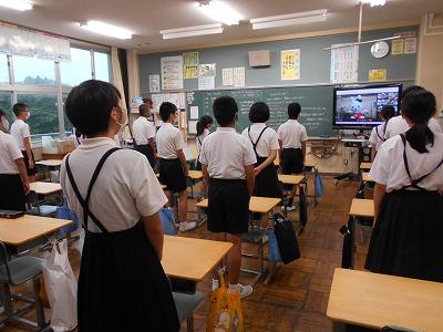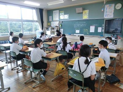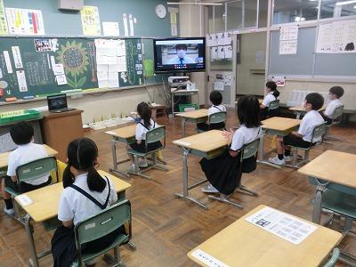 40日間に及ぶ長い夏休みが終わり、今日から2学期が始まりました。それで1限目に始業式を行いました。今回は、新型コロナウィルス感染拡大防止と熱中症予防の観点からMeet機能を活用して、各教室でテレビ画面を見ながらの始業式を実施しました。校長先生からは「心のスイッチ」を入れて、2学期頑張っていきましょう、と激励の言葉がありました。その後、転校生の紹介があり、生活目標(川井先生)、学習目標(西先生)の話と続きました。テレビ画面を見ながらの始業式でしたが、どの学年もとても姿勢よく、しっかり話を聞いていました。