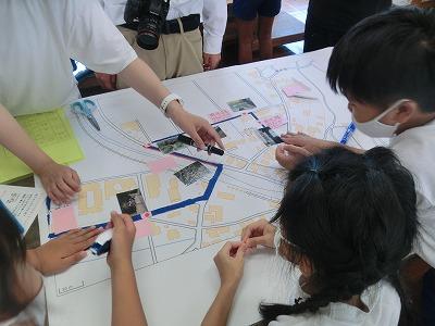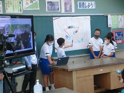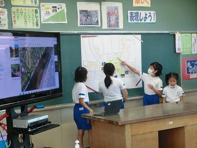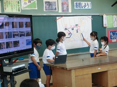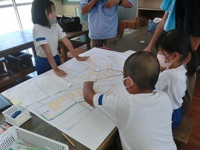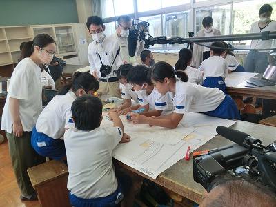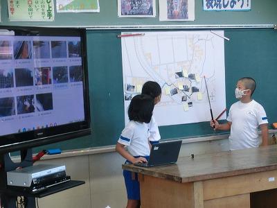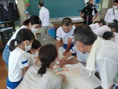 本日、4年生が防災学習に取り組みました。4年社会科の単元「自然災害からくらしを守る」の学習として行いました。昨年に続き、県立大学、県立看護大学の先生方と学生の協力のもと行いました。フィールドワークをした後、防災マップを作成しました。熱中症警戒アラートが発令されていたので、フィールドワークは瀬戸町周辺に限定して行いました。防災マップを作成した後、みんなの前で発表し合いましたが、テレビカメラなどがあったためか、最初はとても緊張している様子が伺えました。でも、徐々に声も大きくなり、練習なしでの発表会でしたが、とても立派に発表していました。さすが大海っ子です。
