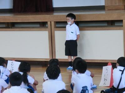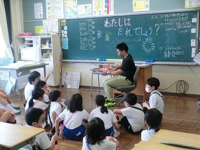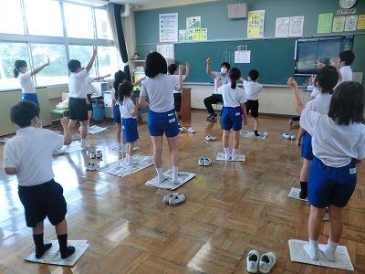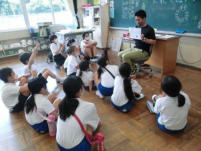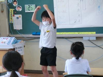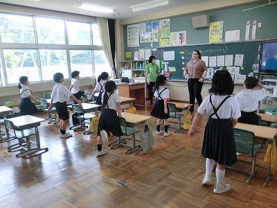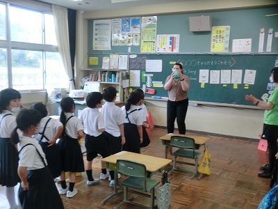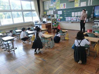 本日、1年生がローラ先生と外国語活動を行いました。簡単な挨拶の練習の後、「えいごでからだをうごかそう」に取り組みました。「あるく」「はしる」「たつ」「すわる」などの動作を英語で表現しながら動きました。子どもたちは楽しそうに「うぉーく」「しっと だうん」と言いながら、歩いたり、座ったりしていました。