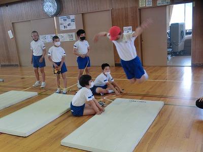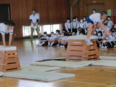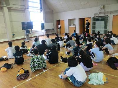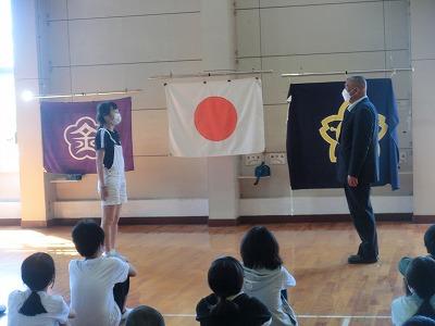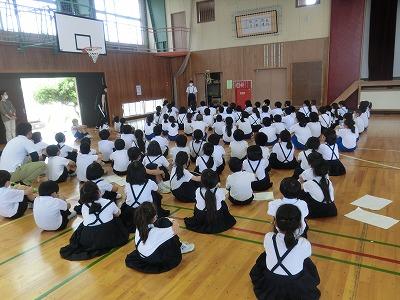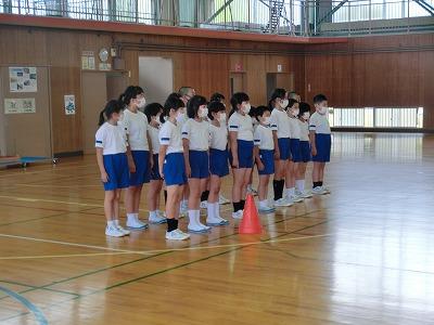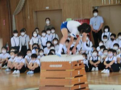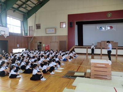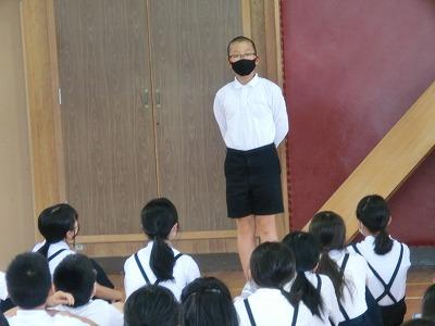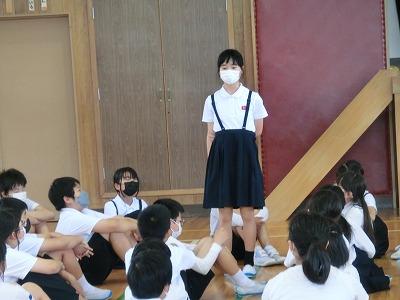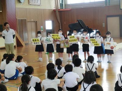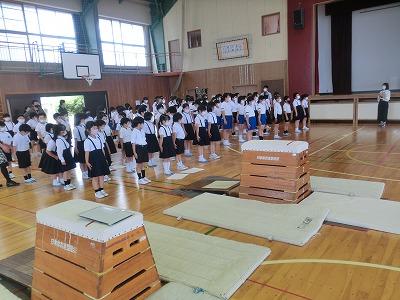 本日より6月。一学期の折り返し地点です。5限目に体育館で学校集会を行いました。集会後に器械運動交歓会のリハーサルをするために跳び箱やマットを設置したため、いつもとは違う場所に並びました。校歌、校長先生のお話に続いて、川井先生からのお話がありました。暑くなってきたので、熱中症を予防するために、体育の授業や登下校の際にはマスクを外しましょう、というお話でした。感染予防も大切ですが、これからは熱中症にならないように気を付けていきましょう。そして、5月の生活目標の振り返りを久しぶりに行いました。感染予防のためにしばらく行っていなかったので、今日は、6年生にお手本を示してもらいました。とても立派に発表できていました。また、6月の生活目標の取組については、2年生がイラストを見せながら上手に発表していました。