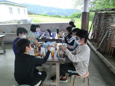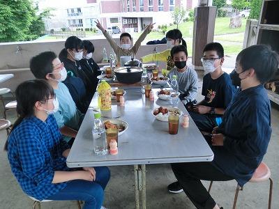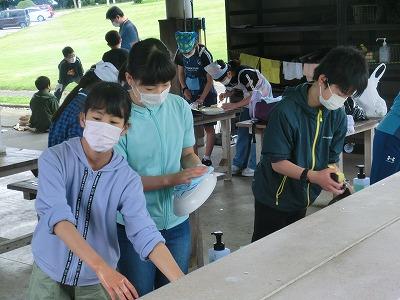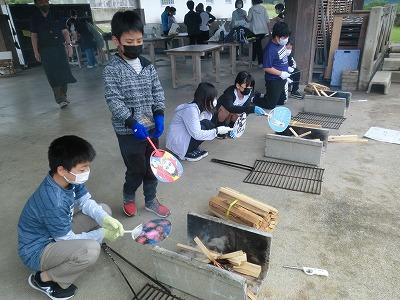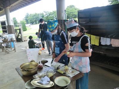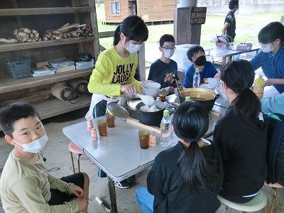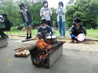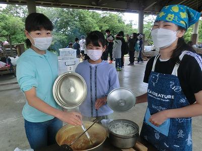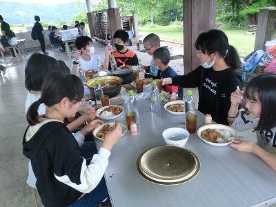 ☆午前の活動は、野外炊飯です。カレーライスづくりに挑戦しました。食器、調理、かまどの各係に分かれて、おいしいカレーができるようにがんばりました。家でもカレーを作ったことがある子もいるようで、手慣れた感じで調理する子もいました。かまどは、もう少し火をつけるのに苦戦するかと思いましたら、意外と上手に火をおこしていました。みんなで協力して作ったカレーの味は、思い出になったと思います。