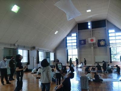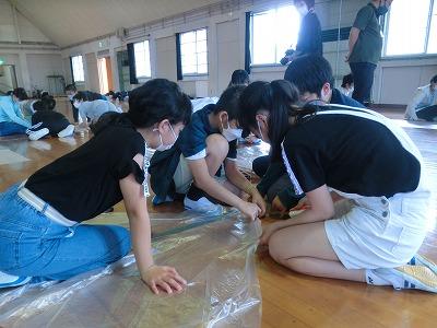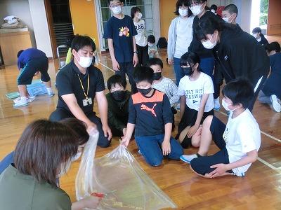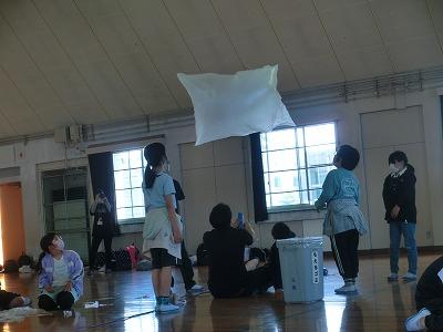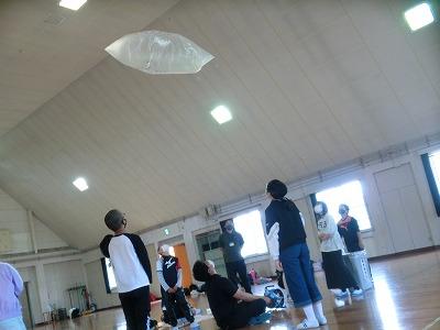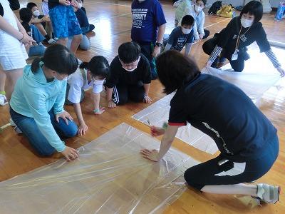 ☆午後は、熱気球を上げました。ビニールの袋を上手に張り合わせて、班で考えた絵を描いて上げました。体育館の中で行ったのですが、天井まで上がった班がたくさんありました。とても楽しそうでした。