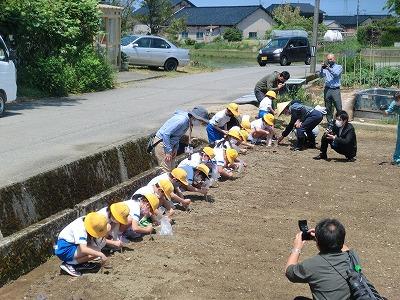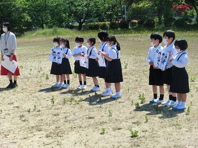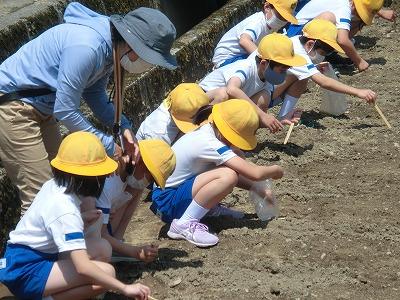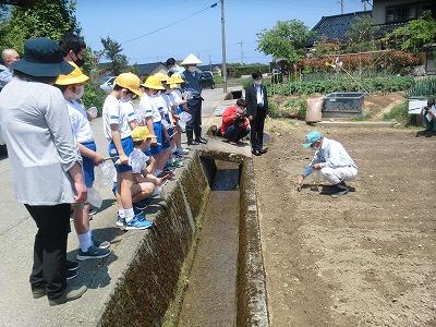 本日、3,4限目に3年生が味噌づくりのための大豆を植えに瀬戸町の畑に行きました。毎年お世話になっている髙﨑武義さん、髙崎政勝さんに今年も教えていただきながら植えました。子どもたちは列が真っすぐになるよう気をつけながら植えていきました。収穫する日が楽しみですね。