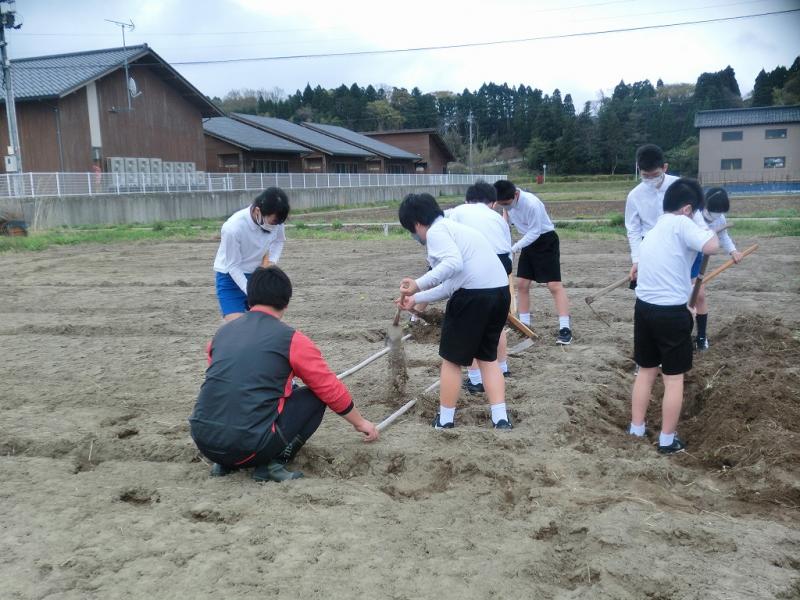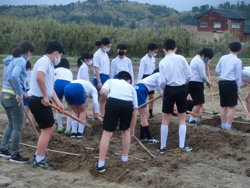 本日3限目に6年生が理科の授業で使うジャガイモを育てるための畑の畝づくりを行いました。担任の先生や学校CNの指導を受けて、一生懸命に畝づくりに取り組みました。慣れない手つきでしたが、なんとか畝を作ることができました。お疲れ様でした。
