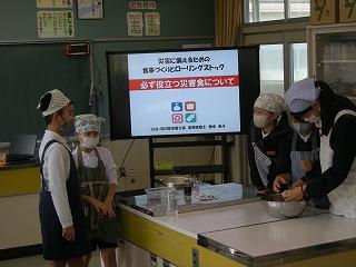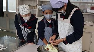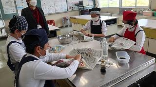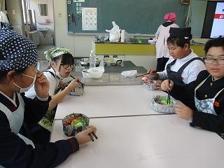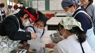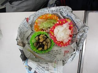 5,6限目に県栄養士会の橋本良子先生から防災への心構えや簡単に作れる防災食、新聞紙で作る器の作り方などを教えていただきました。防災食は「簡単に作れる」とはいうものの、子どもたちにとっては初めての経験なので、先生方にも手伝ってもらいながら作っていました。出来上がった防災食は予想以上においしくできて、みんな笑顔で食べました。