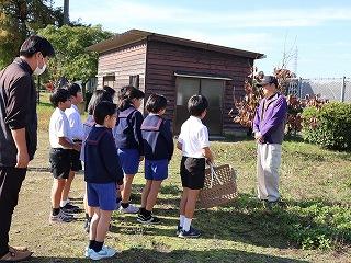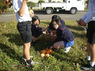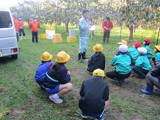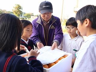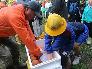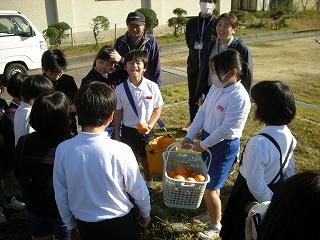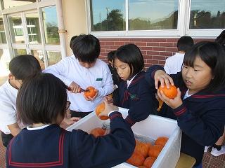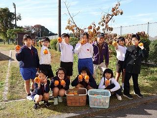 先日の紋平柿収穫体験に続き、3,4年生が学校の運動場にある柿の木のから、紋平柿を収穫しました。大海小の柿栽培の先生、谷口さんに柿のとり方等を教わって、みんなで収穫を楽しみました。3本の木から全部で88個も収穫できました。収穫後には脱渋作業をしました。おいしい紋平柿になるのを楽しみにして待ちます。谷口さん、ありがとうございました。