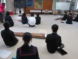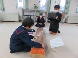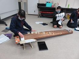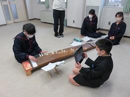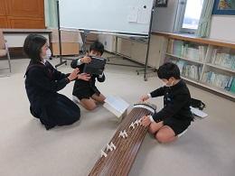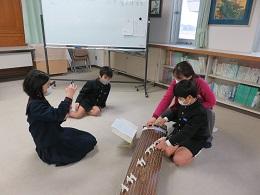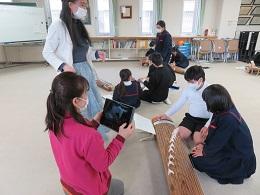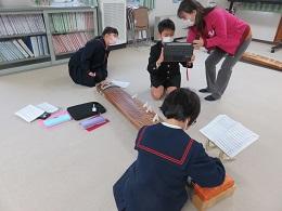 4年生と5年生は、音楽で邦楽や和楽器について学習しています。今年も、川守 雅楽伎先生にお琴を教えていただくことができました。先生の素晴らしい演奏を聞かせていただき、お琴の歴史等についても教えていただきました。子どもたちは、タブレットで友達の手元を撮影しながら、お互いに上手に弾けるようにアドバイスしていました。だんだん音色も良い響きになってきました。