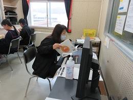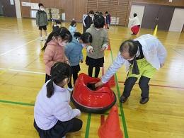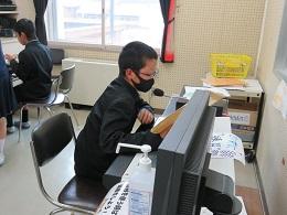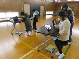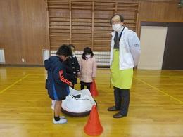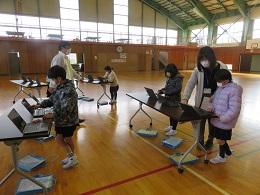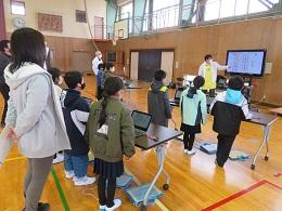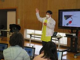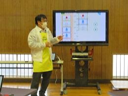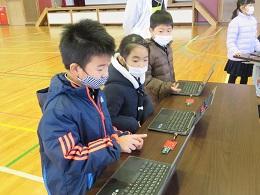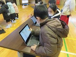 1年生も(株)PFUの方に教えていただいて、ロボットカー(ラディッシュ)の自動運転プログラミングに挑戦しました。身近にあるコンピュータが使われている電化製品などは、入力されたプログラムによって動くことも学習しました。タブレット端末画面の「進む」「右へ」などのマークを選択しながら並べてプログラミングし、何度も何度も試行錯誤しながらロボットカーを運転していました。あきらめずにどうすればよいか考え続けて挑戦する貴重な学習となりました。1年生の主体的な頑張りにも驚かされました。