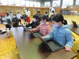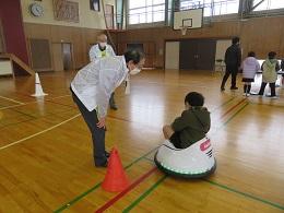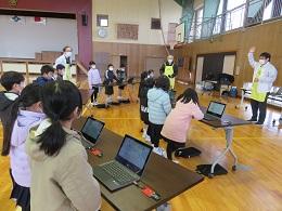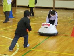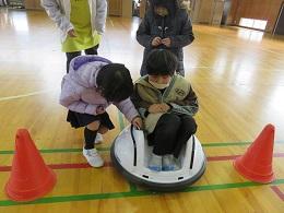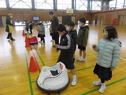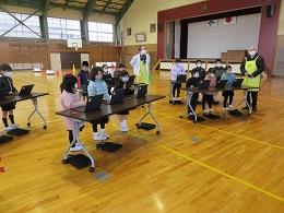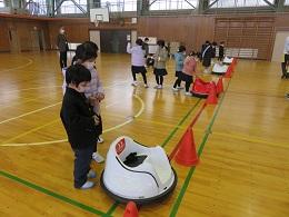今年の1,2年生のプログラミング学習は、一人乗り用のロボットカー(ラディッシュ)の運転プログラムに挑戦です。(株)PFUの講師の方に、生活の中の身近なコンピュータやプログラミングについて教えていただいた後に、運転プログラミングの作成に挑戦しました。各自のタブレット端末に IchigoDakeを差し込んで入力したプログラミングでロボットカーが作動しました。