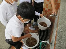 2年生の教室で感心させられました。遠足でみんなで拾ってきたどんぐりについて、これから使うために必要なことは、虫がついている物があるのでまず洗うことだと、本を調べて分かったと発表する女児がいました。それを聞いた子どもたちは、早速バケツに分けて入れ洗い始めました。