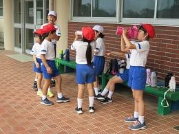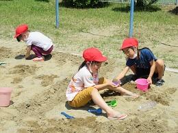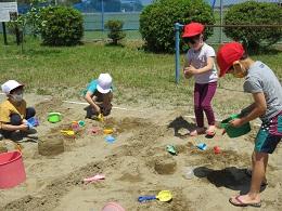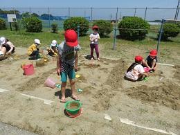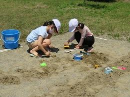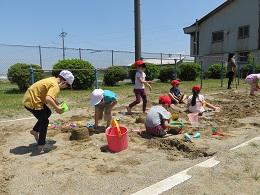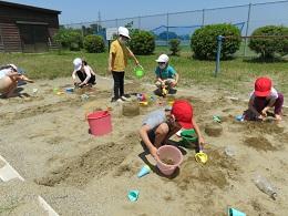 1年生は、図工の「すなやつちとなかよし」の学習で、砂に水を混ぜ、思い思いの形を造っていました。水の分量を考えて固めてみたり形を重ねてみたり、とても楽しそうに工夫しながら活動していました。