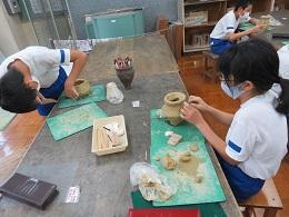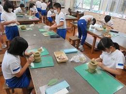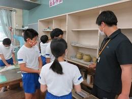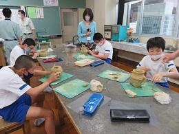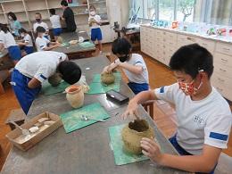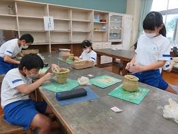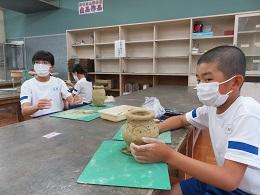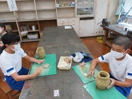 6年生は、市スポーツ文化課の方にご指導いただき、土器づくりに挑戦しました。近くの西山遺跡や縄文時代の人々の暮らし等も教えていただきました。粘土をひも状にして積み上げながら上手に壺を作り上げていました。