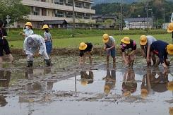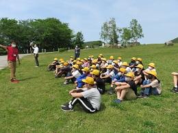 先日、教えていただきながら田んぼの代掻きをしましたが、今回も米作りの先生と地域や保護者の皆さんに田植えを教えていただきました。ぬかるむ田んぼに苦戦しながらも二時間かけて無事に苗を植えることができました。大海子ども園の子どもたちも応援に駆けつけてくれました。