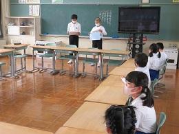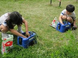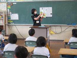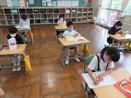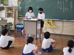 2年生は、生活科の学習として、学校の畑でサツマイモも育てていますが、教室横のミニ学校菜園でも野菜を育てています。トマト・おくら・なすの苗に、「早く大きくなーれ!」と、水やりと声かけを忘れません。