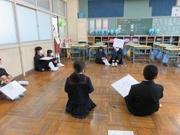 縦割り活動でのなかよし班の「はじめましての会」がありました。自己紹介や班のめあてを確認した後、リーダーたちが準備したクイズやゲームで一緒に楽しみました。運動会や仲良し活動、掃除など、様々な行事や活動で協力しながら頑張る班活動のスタートは、とても良い雰囲気でした。