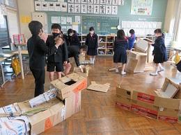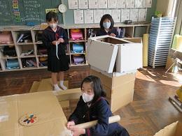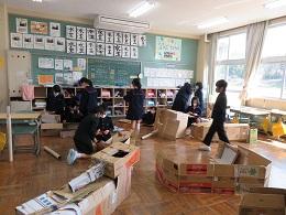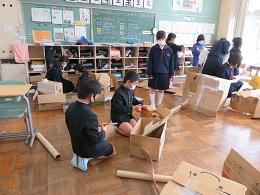 3年生は、図工の時間に「クミクミックス」という学習をしました。段ボールに切込みを入れて組み合わせ、家やロボットや動物など、自分の好きなものを作ってみました。かわいい物やかっこいい物、ダイナミックな物まで、なかなかの力作がそろいました。