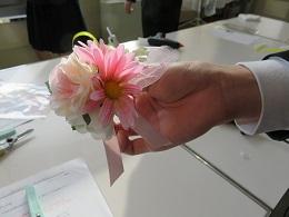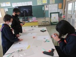 6年生は、地域のフラワーアレンジメントの先生から教えていただいて、卒業式に胸につけるコサージュを手作りしました。材料は同じでもオリジナルコサージュを作ろうと、先生の説明に耳を傾けて一生懸命に配置を考えるなど、熱意ある姿勢で取り組んだことを褒めていただきました。