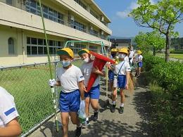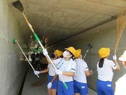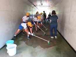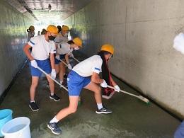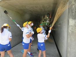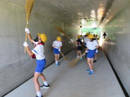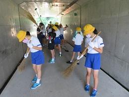 9月11日にトンネルアートを描くため、5,6年生34名でトンネルの埃やクモの巣などを掃除しました。三密を避け交代で休憩をとりながら活動しました。お互いに声を掛け合い、汗びっしょりになりながらも楽しそうにトンネルをきれいにすることができました。