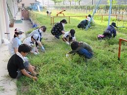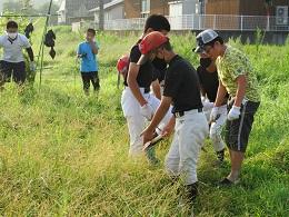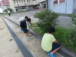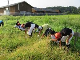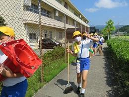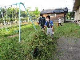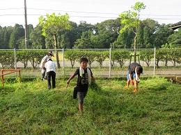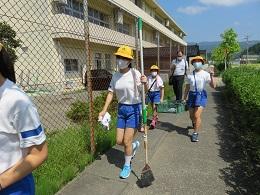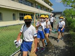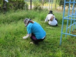 早朝から、子どもたち(4~6年生)と全学年の保護者による「親子奉仕作業」(PTA環境生活部主催)がありました。草でいっぱいになっていた運動場や遊具場、畑等での除草作業や側溝清掃等に多数の方に参加していただきました。子どもたちは、慣れない鎌を使ってでの活動でしたが、一生懸命に取り組んでくれました。保護者の皆様には、休日のお忙しい中早朝から参加していただきありがとうございました。